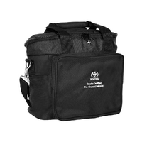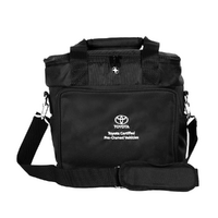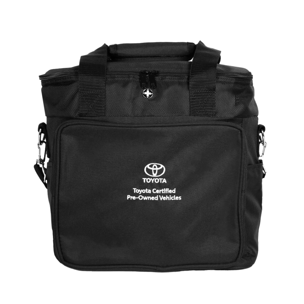 This cooler bag features strong woven carry handles with a Velcro cuff, and an adjustable, removable shoulder strap with a shoulder pad for comfortable carrying. Additional features include a large zippered top closure, a front zippered pocket, and slip pockets on both sides, providing ample storage for all your essentials.