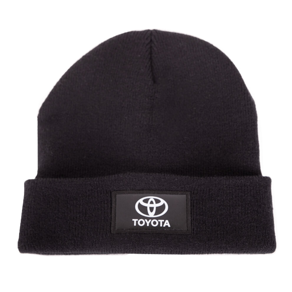 Warm knitted acrylic beanie with a roll up cuff & leather look Toyota patch.