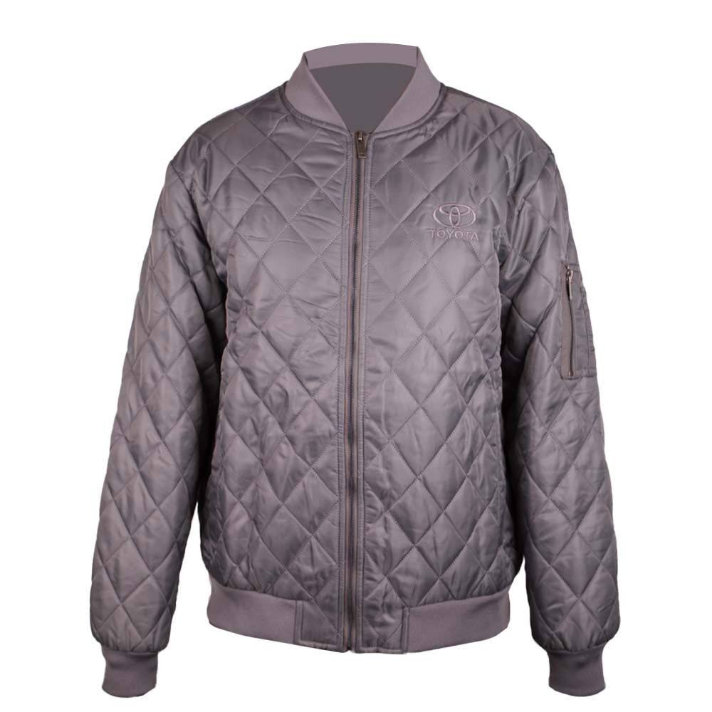 This sleek Toyota Quilted Bomber Jacket, in gunmetal grey, combines style with practicality. It features a warm polyester quilt with a satin lining for added comfort. The jacket includes a functional sleeve pocket with a pen slot and a durable nylon zipper.